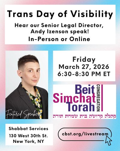 Andy will be a guest speaker at Congregation Beit Simchat Torah (CBST), a queer progressive synagogue in Manhattan for their Trans Day of Visibility Shabbat service. Andy's portion of the service will begin around 7:15.