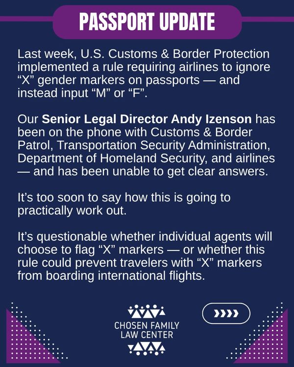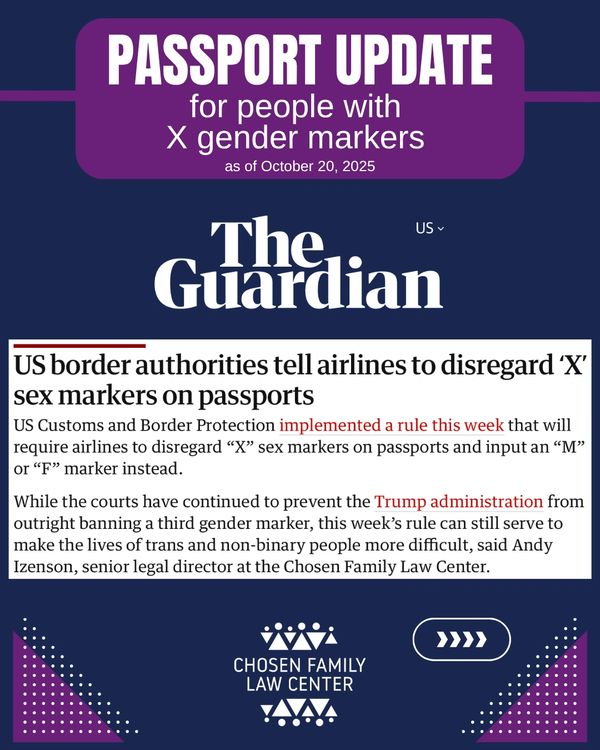Our Senior Legal Director Andy Izenson was interviewed by The Guardian, and has written an update regarding the recent U.S. Customs & Border Patrol rule about X gender markers on passports: