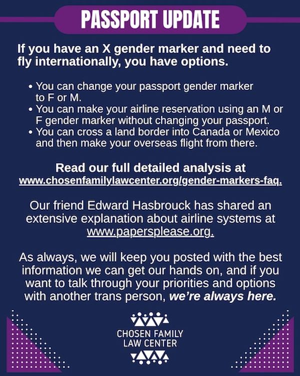 We are keeping a close eye on community members’ applications to change their passports in this window, and we hope to have more data points soon to share with you soon. While we don’t know for sure that it’s possible to get an accurate passport right now, we know that our shot right now is better than it’s been since January. Whether you decide to take the chance is a highly personal decision. As always, the Chosen Family Law Center is here for you, and we aren’t going anywhere.